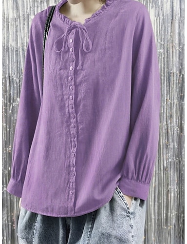 Damen Bluse Elegante Oberteile Kunstbaumwollleinen Gerafft Patchwork Knöpfe Einfarbig Einfach Elegant Damen Basic Langarm Hemdkragen Normale Oberteile Täglich Arbeit Ferien Schwarz Purpur Sommer