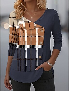 Damen Bluse Tunika V-Ausschnitt Langarm Knöpfe Grafik Geometrisch Karo Mode Lässig Rundhalsausschnitt Regelmäßige Oberteile Täglicher Patchwork Druck Rot Blau Orange Grün Frühling Herbst Winter