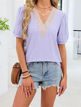 Damen T Shirt Sommeroberteile Patchwork Lochmuster Einfarbig Elegant Mode Klassisch Kurzarm V Ausschnitt Normale Oberteile Täglich Ausgehen Wochenende Blau Schwarz Weiß Rosa Purpur Sommer Frühling