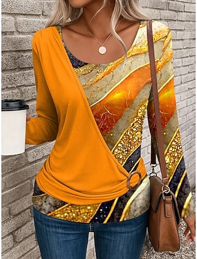 Damen T Shirt Patchwork Druck Grafik Geometrisch Stilvoll Lässig Langarm Rundhalsausschnitt Normale Oberteile Täglich Blau Gelb Rote Purpur Grün Sommer Herbst Winter