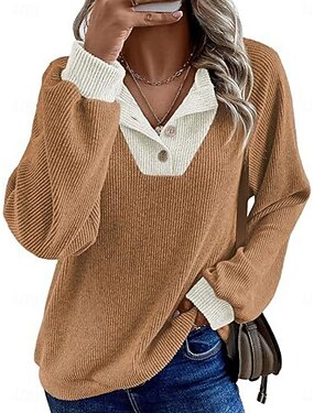 Damen Rippstricktops Bluse Textur Patchwork Farbblock Knöpfe Farbblock Vintage Stilvoll Lässig Langarm Rundhalsausschnitt Normale Oberteile Täglich Blau Sommer Frühling Herbst
