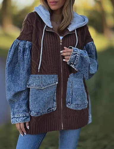 Damen Wintermantel Jeansjacke Warm Bequem Patchwork Reißverschluss Tasche Lässig Patchwork Urlaub Straße Lässig Alltagskleidung Regulär Mit Kapuze Normale Passform Langarm Oberbekleidung Schwarz