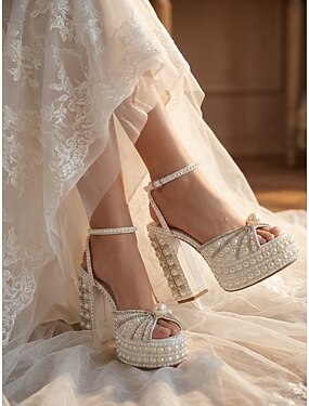 Weiße, elegante Plateau-Sandalen mit offener Zehenpartie und Schleifendetail für die Braut, perfekt für eine Hochzeit in der Stadt &Empfang