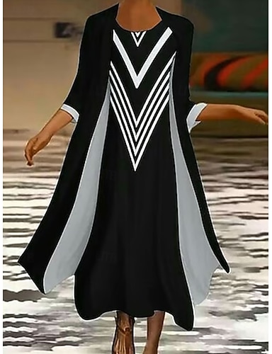 Damen Kleid-Set Maxidress Shiftkleid Sommerkleid Lässig Grafik Geometrisch Geschichtet Druck Maxikleid Dreiviertelarm Rundhalsausschnitt Täglich Blau Schwarz Orange Frühling Herbst Lässiger Schnitt