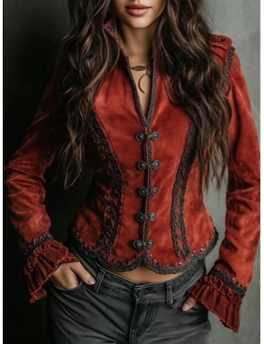 Damen Hemd Samt Freizeithemd Rüschenhemd Einfach Vintage Stilvoll Klassisch Langarm Mandarinkragen Normale Oberteile Täglich Ferien Ausgehen Rote Frühling Herbst
