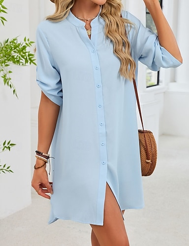 Damen Sommerhemd Freizeithemd Knopfhemd Bluse Knöpfe Einfarbig Elegant Urlaub Täglich Kurzarm Umlegekragen Normale Oberteile Täglich Strand Ferien Blau Weiß Rosa Himmelblau Grün Sommer Frühling