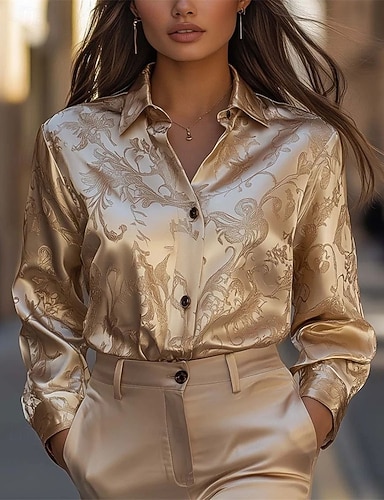 Damen Elegant Satin-Top Bluse Elegante Oberteile Gerafft Patchwork Knöpfe Blumen Grafik Einfach Elegant Vintage Damen Langarm Hemdkragen Normale Oberteile Täglich Arbeit Ferien Gold Frühling Herbst