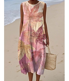 Damen Midi Kleid Leinenähnliches Sommerkleid Shift Kleid A-Linien Kleid Urlaub Freizeit Boho Strand Party Ausgehen Lockere Passform Floral Grafik Ärmelos Rundhalsausschnitt Blau Grau Rosa Beige