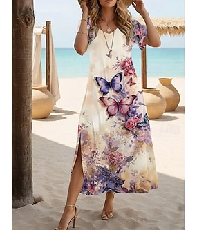 Damen Midikleid Sommerkleid A Linie Kleid Urlaub Lässig Boho Schmetterling Urlaub Ausgehen Normale Passform Blumen Grafik Regenbogen Kurzarm Rundhalsausschnitt Blau Rot orange Violett Purpur Sommer