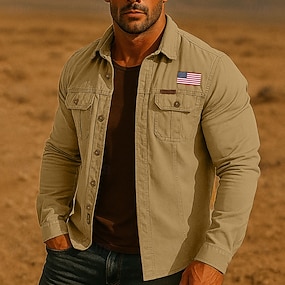 Herren US Flagge Patriotisch Arbeitshemd Westernhemd Cargohemd Langarm Lässig Taktisch Sport im Freien Arbeitskleidung Frühling Herbst Umlegekragen Zwei Fronttaschen Hemden mit Knopfleiste Armeegrün