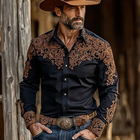 Herren Kuhmuster Ethnisch Komplizierte Blumen Hemd Westernhemd Cowboy-Shirt Langarm Vintage-Retro Lässig Outdoor Arbeitskleidung Frühling Herbst Umlegekragen Zwei Fronttaschen Leinenähnliches Hemd