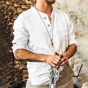Herren Hemd leinenhemd Sommerhemd Strandbekleidung Knopfhemd Feste Farbe Strasse Täglich Weiß Blau Grün Khaki Langarm Gefaltete Kragen Bekleidung Tasche