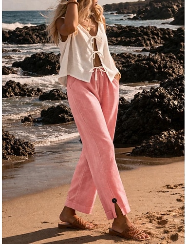 Damen Kunstbaumwollleinen Weites Bein Sommerhose Hosen Hose Urlaub Mode Basic Volle Länge Natürliche Taille Einfach Tasche Elastischer Bund Komfort Schnelltrocknend Weich Täglich Outdoor Streetwear