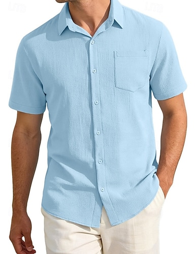 Herren Hemd Waffelhemd Freizeithemd Knopfhemd Schwarz Weiß Hellgrün Rosa Burgunderrot Kurzarm Einfach Großvaterkragen Lässig Täglich Fronttasche Bekleidung Elegant Mode Lässig