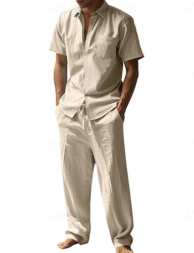 Herren Leinenhemd Zweiteilig Hemd Set Und Leinenhosen Hose Freizeithose Set Einfach Täglich Outdoor Urlaub Umlegekragen Kurzarm Sommer Mode Lässig Bequem Bekleidung