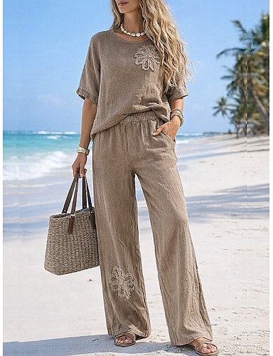 Damen Hosen-Sets Bolero Kunstbaumwollleinen Halbarm Rundhals Blumen Mode Streetwear Lässig Täglich Outdoor Braun Sommer Normale Passform