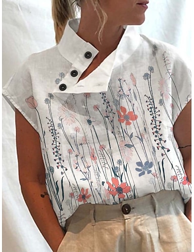 Damen T Shirt T-Shirt Knöpfe Druck Blumen Mode Stilvoll Klassisch Kurzarm Rollkragen Normale Oberteile Täglich Ausgehen Wochenende Rosa Purpur Sommer Frühling