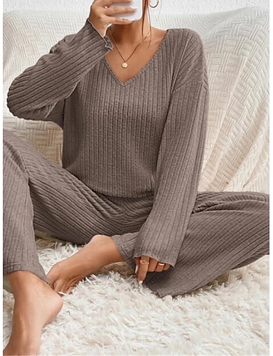 Loungewear-Sets für Damen in reinen Farben, lässig, bequem, weich, für zu Hause, für den Alltag, Urlaub, Strick, atmungsaktiv, V-Bügel, langärmelig, Pullover, Hose, Herbst-Winter-Home-Outfits