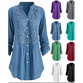 Damen Hemd Bluse Gerafft Spitze Knöpfe Einfach Elegant Stilvoll Langarm V Ausschnitt Normale Oberteile Täglich Ferien Ausgehen Blau Schwarz Weiß Wein Purpur Frühling Herbst Winter