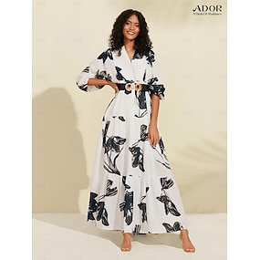 Damen Schwingkleid Druckkleid Maxikleid Schwarz-Weiß Blumen / Pflanzen Jeansstoff Mit Gürtel Sommer V Ausschnitt Urlaub Musterkleid S M L
