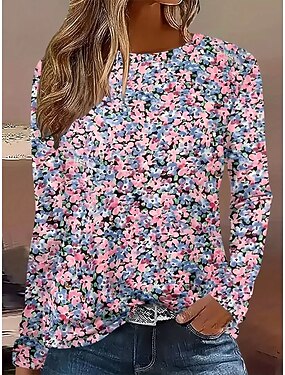Damen T Shirt Druck Ombre Blumen Grafik Vintage Stilvoll Klassisch Langarm Rundhalsausschnitt Rundhals Normale Oberteile Täglich Blau Rosa Frühling Herbst Winter