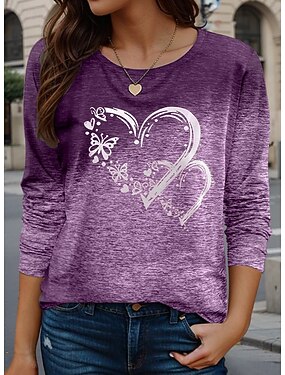 Valentin Frauen Herz T-Shirt Freizeit Regelmäßige Oberteile Druck Reguläre Passform Täglich Lila Frühling Herbst