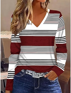 Damen T Shirt Druck Grafik Geometrisch Gestreift Vintage Stilvoll Klassisch Langarm V Ausschnitt Normale Oberteile Täglich Blau Kastanienbraun Braun Frühling Herbst Winter