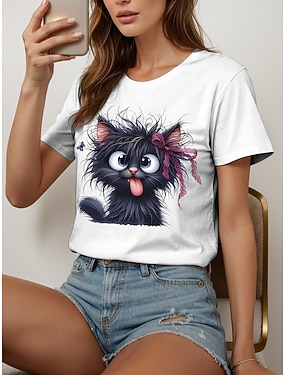 Damen T-Shirt Basic Katzen-Print Kurzarm Normale Oberteile Rundhals Casual Weekend Weiß
