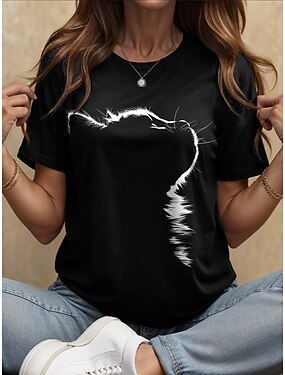 Damen T-Shirt modischer Katzen-Print Kurzarm normale Oberteile Rundhalsausschnitt Alltag Wochenende Schwarz Gelb Marineblau Beige Sommer