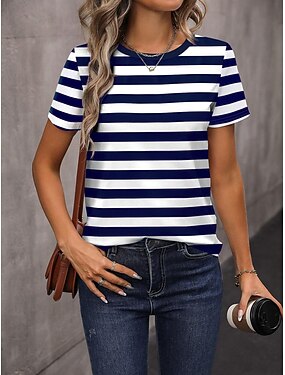 Damen T Shirt Druck Grafik Gestreift Stilvoll Lässig Kurzarm Rundhals Normale Oberteile Täglich Wochenende Marineblau Sommer Frühling