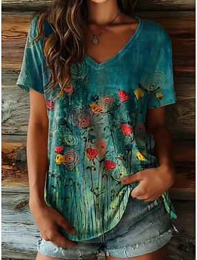 Damen T Shirt Druck Blumen Grafik Vintage Stilvoll Klassisch Kurzarm V Ausschnitt Normale Oberteile Lässig Täglich Ausgehen Blau Grün Sommer Frühling