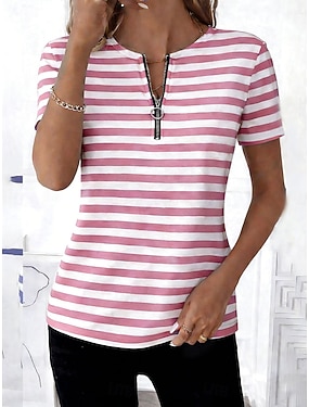Damen T Shirt Viertel Postleitzahl Grafik Gestreift Tropisch Hawaiianisch Stilvoll Kurzarm Rundhalsausschnitt Normale Oberteile Strandhochzeit Täglich Sport Blau Schwarz Rosa Grün Sommer Frühling