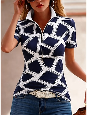 Damen T Shirt Reißverschluss Viertel Postleitzahl Grafik Geometrisch Farbblock Tropisch Hawaiianisch Stilvoll Kurzarm V Ausschnitt Normale Oberteile Strandhochzeit Täglich Sport Blau Schwarz Rote Grün