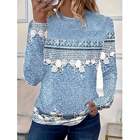 Damen T-Shirt Langarm Floral Grafik 3D Vintage Stilvoll Lässig Langarm Rund-Ausschnitt Reguläre Oberteile Tägliche Print Hellblau Herbst Winter Vorherherbst