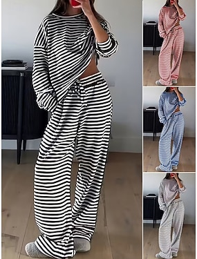 Damen Trainingsanzug Hosen-Sets Langarm Rundhalsausschnitt Gestreift Elegant Mode Streetwear Lässig Täglich Outdoor Blau Schwarz Rote Sommer Lässiger Schnitt