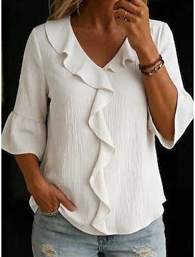 Damen Bluse Kunstbaumwollleinen Rüsche Einfarbig Stilvoll Lässig Dreiviertelarm V Ausschnitt Normale Oberteile Täglich Schwarz Weiß Rosa Rote Grün Frühling Herbst