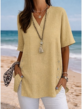 Damen Bluse Hemd aus Leinenimitat Knöpfe Einfarbig Täglich Stilvoll Basic Halbarm V Ausschnitt Normale Oberteile Täglich Blau Schwarz Gelb Rote Purpur Sommer Frühling Herbst