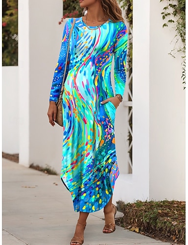 Damen Maxikleid Etui-Kleid T-Shirt-Kleid Urlaub Lässig Täglich Normale Passform Grafik Geometrisch Abstrakt Langarm Rundhalsausschnitt Blau Rote Purpur Grün Sommer Frühling Herbst