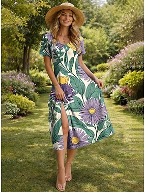 Damen Midikleid T-Shirt-Kleid A Linie Kleid Sommerkleid Urlaub Lässig Strand Lässiger Schnitt Blumen Grafik Kurzarm Rundhalsausschnitt Schwarz Purpur Orange Grün Sommer Frühling