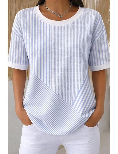 Damen T Shirt Druck Gestreift Grafik Gestreift Abstrakt Stilvoll Klassisch Lässig Kurzarm Rundhalsausschnitt Normale Oberteile Täglich Blau Salbeigrün Rosa Rote Sommer Frühling