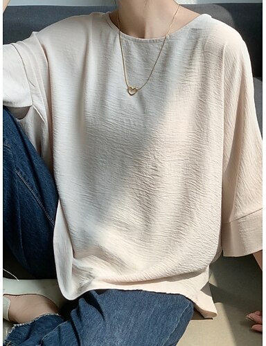 Damen Bluse Gerafft Einfarbig Täglich Basic Lässig Dreiviertelarm Rundhalsausschnitt Normale Oberteile Täglich Weiß Marineblau Grün Aprikose Sommer Frühling Herbst