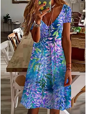 Damen Minikleid Freizeitkleid T-Shirt-Kleid Sommerkleid A Linie Kleid Urlaub Lässig Boho Strand Normale Passform Blumen Grafik Kurzarm V Ausschnitt Blau Schwarz Purpur Grün Sommer Frühling