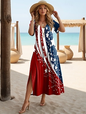 Amerikanischer Unabhängigkeitstag Damen Midikleid Shiftkleid Sommerkleid T-Shirt-Kleid Urlaub Lässig Ferien Normale Passform Grafik Amerikanische Flagge Kurzarm V Ausschnitt Blau Schwarz Weiß Wein