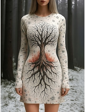 Damen Minikleid Shiftkleid T-Shirt-Kleid Urlaub Lässig Ferien Date Grafik Blatt Langarm Rundhalsausschnitt Beige Frühling Herbst Winter