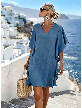 Women's Baumwoll-Leinen Maxikleid A-Linie Kleid Casual Täglich Lässige Passform Einfarbig Halbärmelig V-Ausschnitt Blau Sommer Frühling Herbst