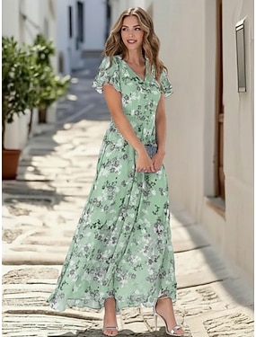 Damen Maxikleid Boho-Kleid Freizeitkleid Vintage Täglich Outdoor Strand Lässiger Schnitt Blumen Kurzarm U-Ausschnitt Grün Sommer Frühling