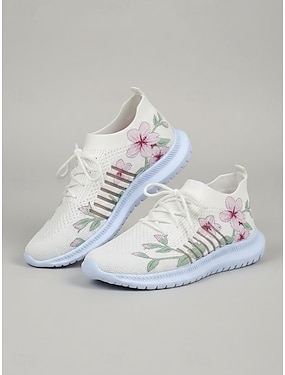 Weiße Damen-Sneaker aus Flyknit mit Blumenmuster – atmungsaktive, leichte Sportschuhe, lässige Laufschuhe für Reisen, Fitnessstudio und Alltag