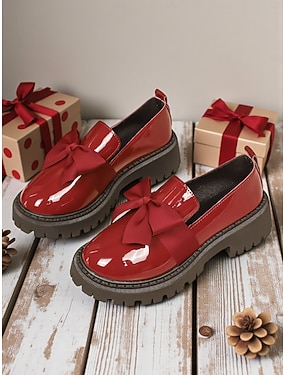 Damen Burgunderfarbene Lackleder Slip-On Loafers mit Schleife – Chunky Plattformschuhe für lässige Ausflüge Alltagstragen und Weihnachtsferien