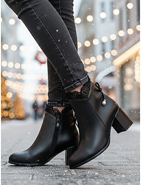 Schwarze Damen-Stiefeletten aus Kunstleder mit Perlenanhänger und Blockabsatz – elegante Winter-Kurzstiefeletten für Damen, perfekt für Büro, Streetwear und Alltagsoutfits