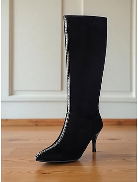Schwarze kniehohe Damenstiefel mit Strassbesatz – spitze Stiefel mit Stilettoabsatz für den täglichen Ausflug, den Abend und die Herbst-Winter-Mode
